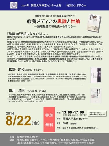 Cafe-Intellektuellen Kyotoにて熟議を重ねてきた研究会のメンバーが再び、今度は東京に集まります。 8月22日関西大学東京センターにて、気鋭の教育社会学者さんとベテランジャーナリストさまをゲストをむかえ『日本の論壇雑誌』のシンポジウムがあります。…